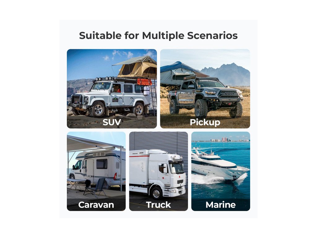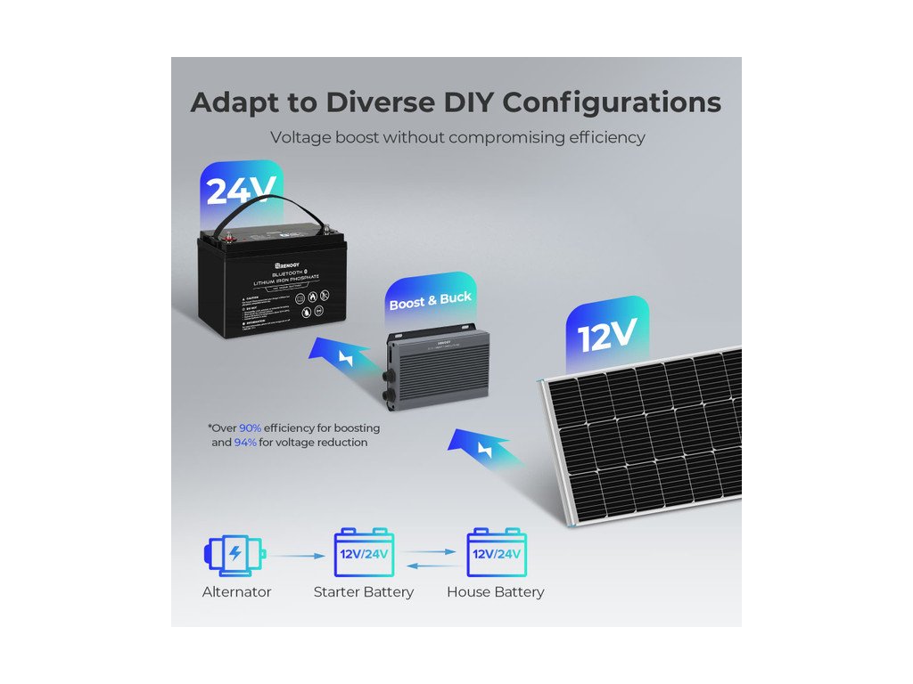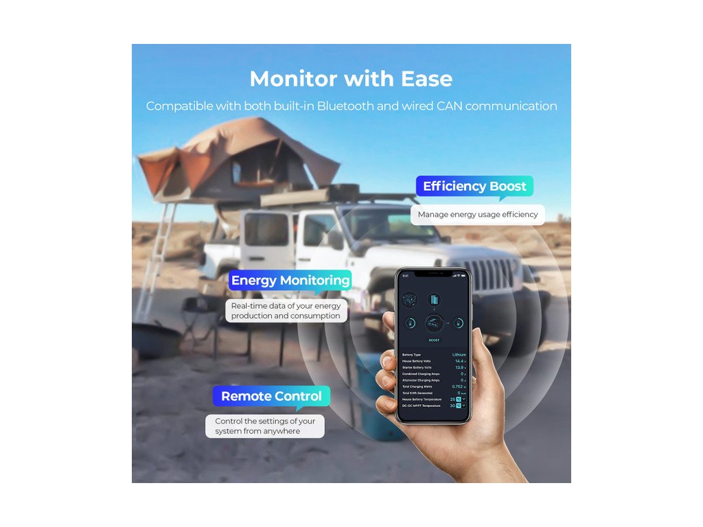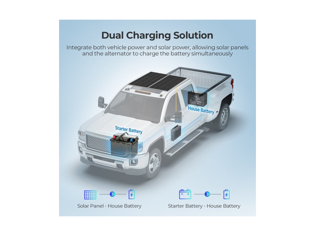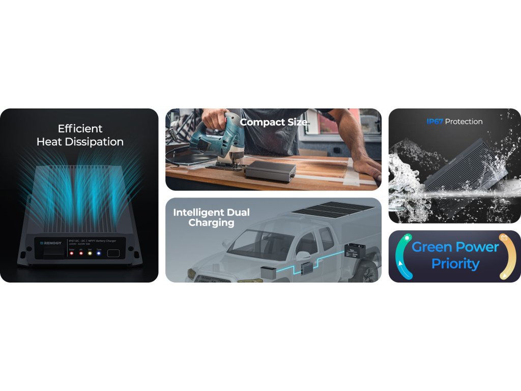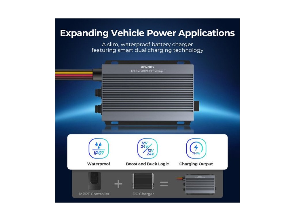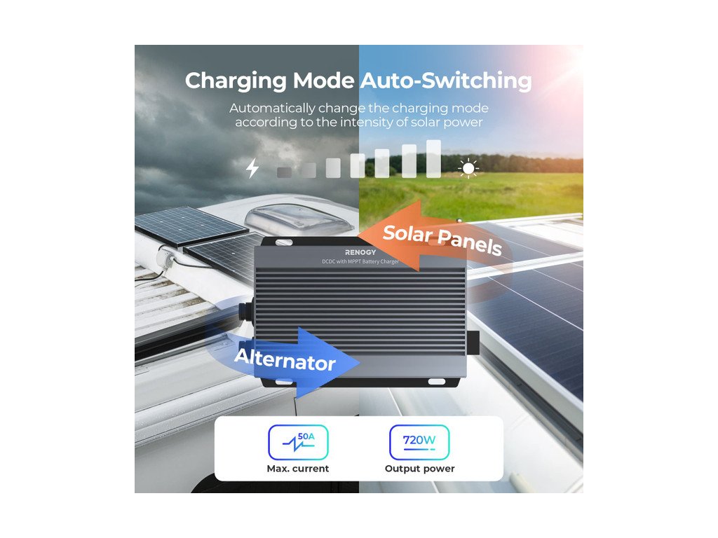 Představujeme RENOGY IP67 50A DC-DC duální nabíječku baterií s MPPT. Tenké, vodotěsné dvoukanálové nabíjecí řešení ideální pro stísněné prostory. Vybavena inteligentní logikou boost a buck, bez problémů podporuje 12V/24V-12V/24V napěťové systémy, čímž posouvá možnosti kutilských projektů na maximum. Exkluzivní inteligentní nabíjecí logika od Renogy upřednostňuje solární energii, efektivně nabíjí vaši nadstavbovou baterii a zároveň snižuje zatížení generátorů (alternátorů). Tento inovativní produkt kombinuje energii z alternátoru a solární energii, automaticky přizpůsobující režimy podle intenzity slunečního světla. Maximálně využívá energii s robustním proudem 50A a působivým výstupním výkonem 720W. Renogy IP67 duální nabíječka baterií bezproblémově přepíná na solární nabíjení při dostatečném slunečním světle a plynule přechází na generátorové nabíjení během slabého osvětlení, zajišťujíc nepřetržitou energii pro vaše zařízení. Přijměte ekologické nabíjení bez kompromisů v účinnosti nebo prostoru, předefinujíc udržitelné využívání energie.