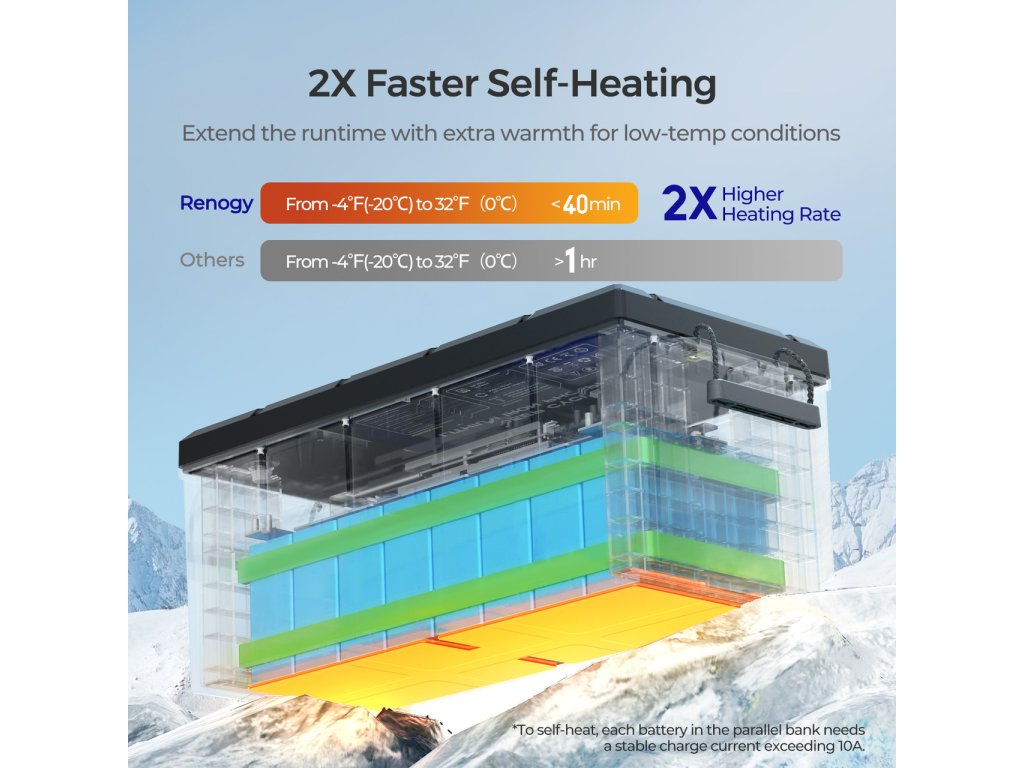 S nejvýkonnějšími 200W vyhřívacími prvky v oboru se tato 12V 300Ah LiFePO4 baterie dokáže zahřát 2x rychleji než jiné vyhřívané baterie na trhu. Pro zahájení samoohřívání zajistěte stabilní nabíjecí proud větší než 10A pro každou baterii.