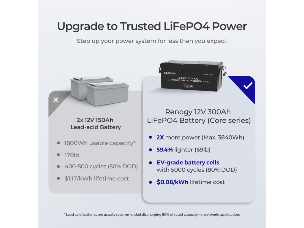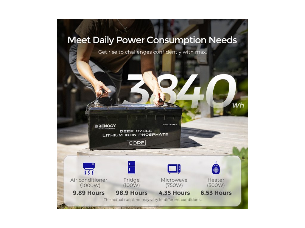 Renogy 12V 300Ah CORE LiFePO4 baterie vám nabízí konzistentní výkon, který je téměř 10krát delší než u průměrné olověné baterie, a obsahuje bateriové články ev-grade (třída baterií používaná v elektromobilech, s ohledem na kvalitu a rychlé nabíjení a vybíjení) pro zajištění dlouhotrvajícího výkonu.