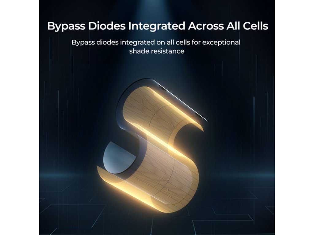 Bypass diody integrované ve všech solárních článcích zajišťují stabilní proud i za zastíněných podmínek. Kde mono nebo poly krystalické panely mají výkon 0W, CIGS panel stále perfomuje. Dokonca i při zastínění víc jak 90%.