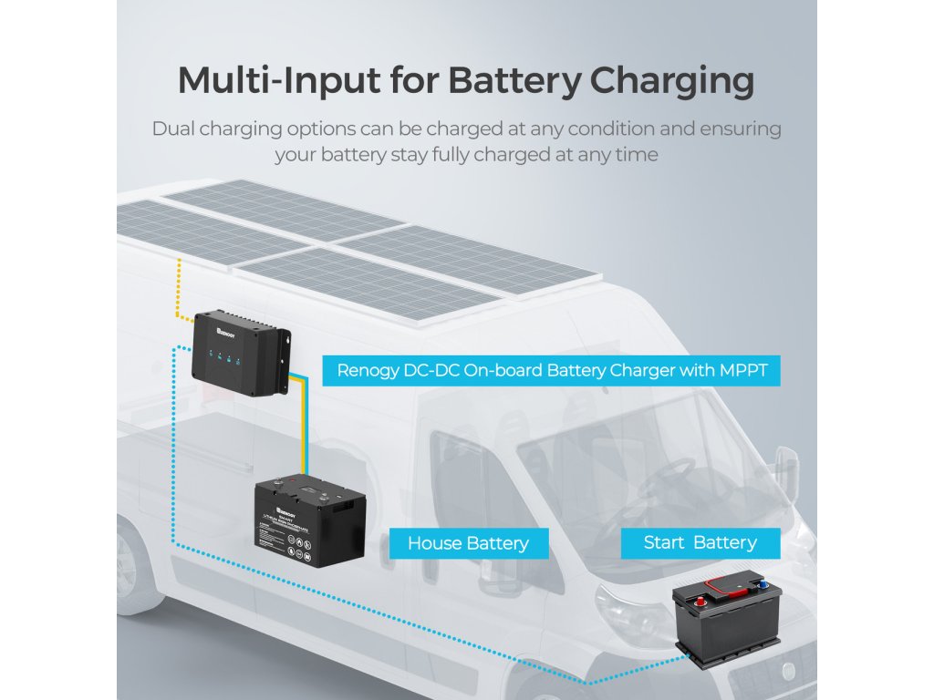 Renogy DC/DC nabíječka baterií s MPPT regulátorem může nabíjet palubní baterii dvěma různými způsoby. Vícestupňová nabíječka může využívat jako zdroj elektrické energie připojené solární panely nebo alternátor spojený se startovací baterií.
