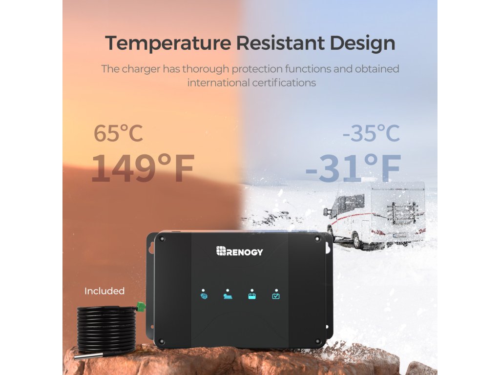 Palubní nabíječka baterií Renogy DC-DC s MPPT regulátorem je navržena tak, aby vám poskytla možnost úspory místa a hmotnosti. Tato více vstupová nabíječka baterií může nabíjet palubní baterii z alternátoru nebo pomocí solárních panelů připojených přímo k jednotce. Zatímco alternátor vozidla upřednostňuje startovací baterii, tato jednotka umožní zároveň nabíjet i palubní baterii! Je to chytrý způsob, jak déle udržet akumulátory plně nabité i mimo síť! S vícestupňovým nabíjením nabíječka Renogy DC-DC MPPT Charger umožňuje nabíjení trakčních, gelových, AGM nebo lithiových baterií. S komunikačním portem RS485 můžete využívat funkce monitorování pomocí modulu Bluetooth BT-2 a aplikace Renogy DC Home, ovládat a monitorovat zařízení na dálku prostřednictvím telefonu v reálném čase. A pro zkušené uživatele nabízí i možnost nastavení vlastního průběhu a hodnot nabíjení.