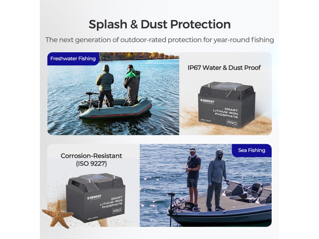 Baterie Renogy Smart 100 Ah PRO se může pochlubit dvojitou aktivní ochranou proti přetížení, což zajišťuje bezpečný provoz i v náročných podmínkách. Kromě toho je pouzdro navrženo tak, aby minimalizovalo riziko šíření případného požáru, a to po dobu až 10 sekund.