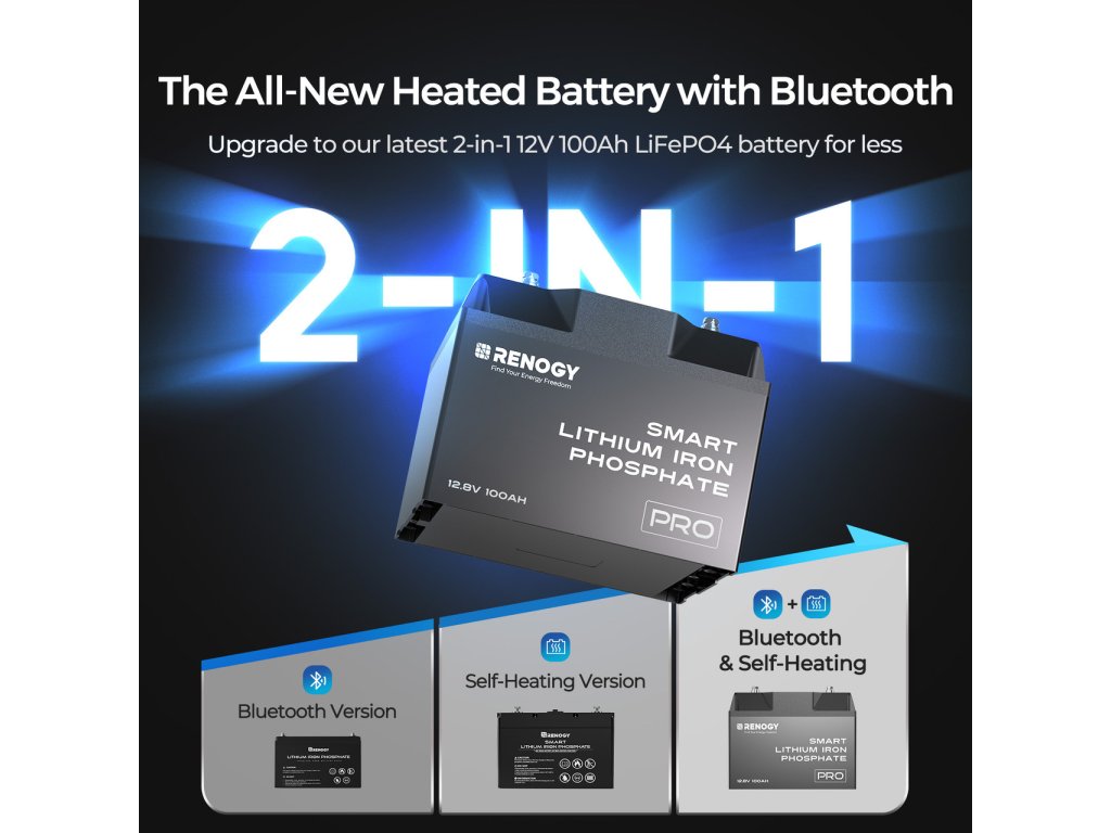 S naší nejnovější LiFePO4 baterií Renogy Smart 100 Ah PRO máte jistotu optimálního výkonu a spolehlivosti. S vestavěným Bluetooth modulem a vlastním vyhřívacím systémem přináší tato baterie revoluční technologie přímo do vašich rukou.