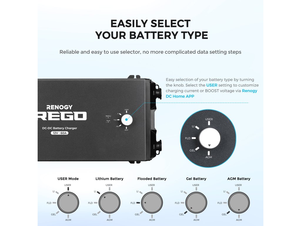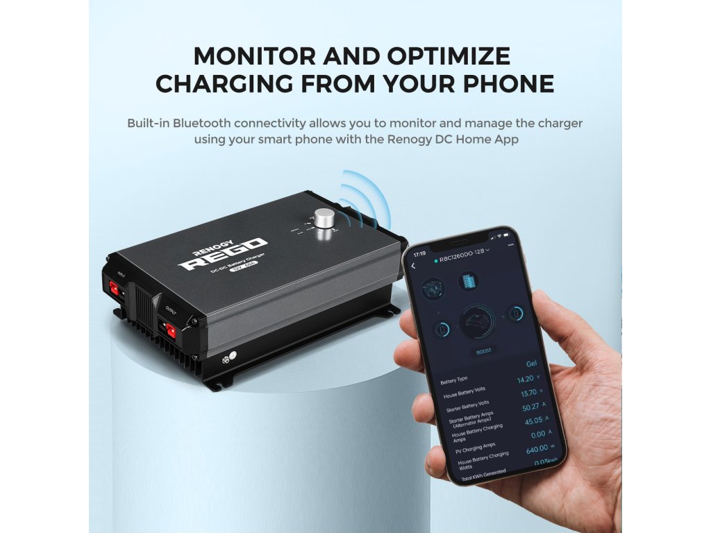Nabíječka baterií REGO DC-DC obsahuje vestavěný modul Bluetooth, který vám umožňuje sledovat stav nabíjení pomocí aplikace Renogy DC Home na vašem smartphonu. Nastavením voliče typu baterie na USER MODE budete také moci upravit Boost Voltage, Float Voltage a Boost Duration v aplikaci.