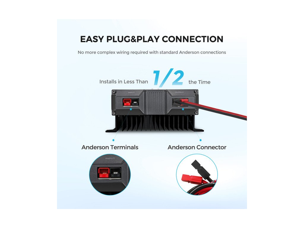 Nabíječka baterií RENOGY REGO DC-DC využívá 75A koncovky Anderson a speciálně navržené konektory Anderson-Ring Lug pro jednoduchý a snadný způsob připojení k bateriím, což zkracuje dobu instalace o 60 %!