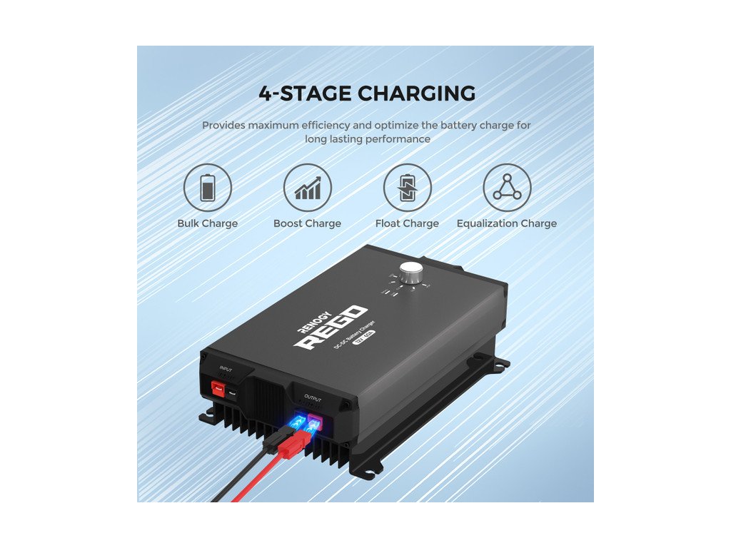 Exkluzivní technologie obousměrného nabíjení REGO DC-DC Battery Charger poskytuje nejen nejúčinnější způsob nabíjení vašich domácích baterií ze startovací baterie na cestách, ale také dobíjí a udržuje vaši startovací baterii, když jsou domácí baterie plné. Nabíječka baterií je kompatibilní s nejoblíbenějšími 12V alternátory a bateriemi. 4-stupňové nabíjení zajišťuje spolehlivé a efektivní nabíjení vašich baterií. Nabíječka baterií REGO DC-DC je ideální pro obytné vozy, užitková vozidla, lodě, jachty a dodávky, které potřebují stabilní energii na cestách!