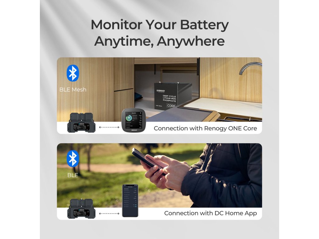Zajišťuje přesné monitorování baterie prostřednictvím aplikace Renogy ONE Core a DC Home App.