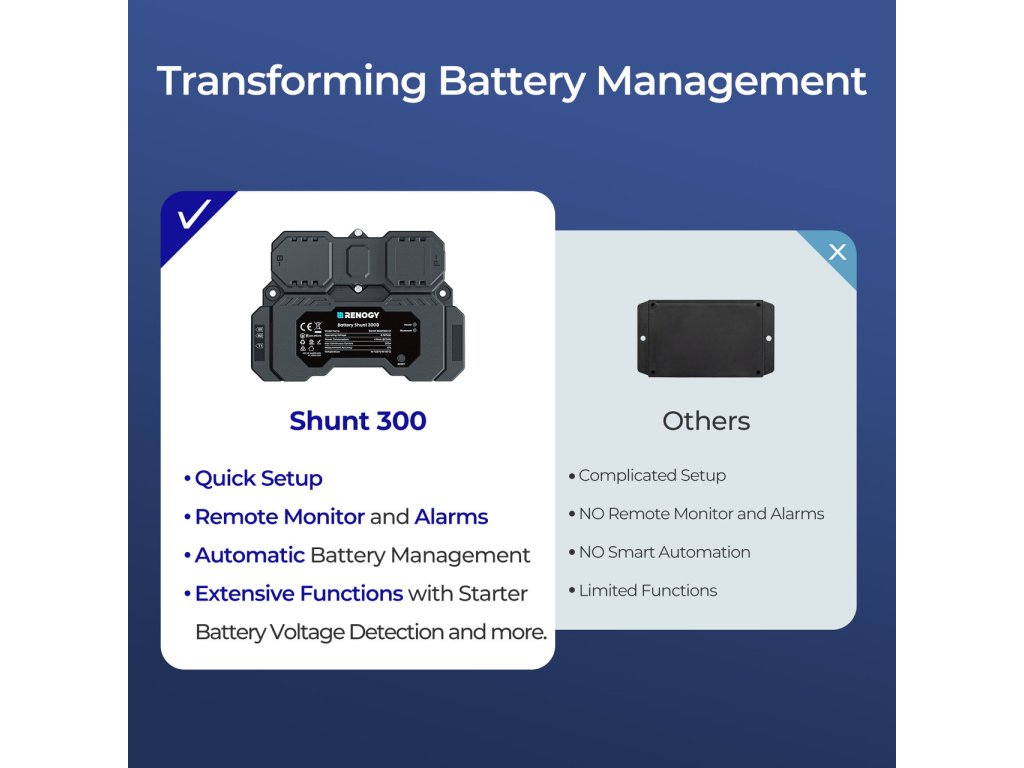 Renogy Smart Shunt 300 je kompatibilní se všemi vašimi startovacími bateriemi a hlavními bateriemi, včetně olověných (AGM, GEL), lithium-železitých, lithium-iontových a nikl-metalových hybridních.