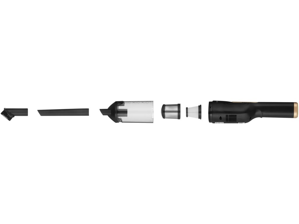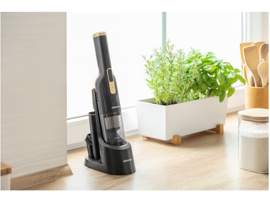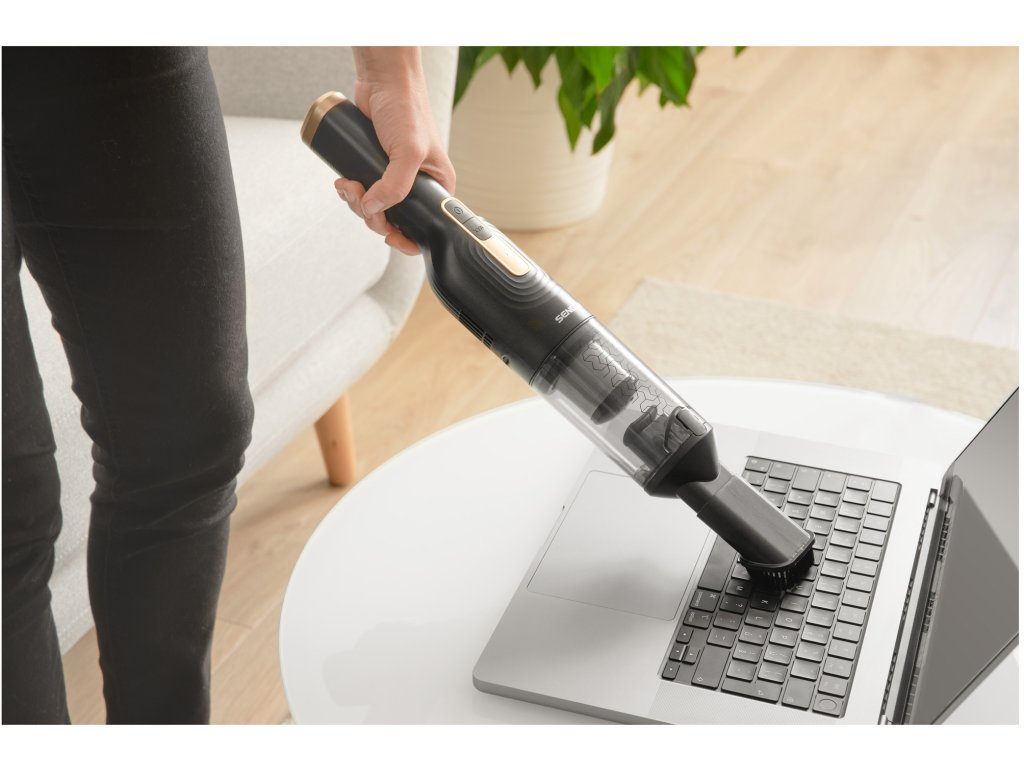 - Bezšňůrový ruční vysavač s nabíjecí základnou pro praktické uložení vysavače a s integrovaným držákem příslušenství